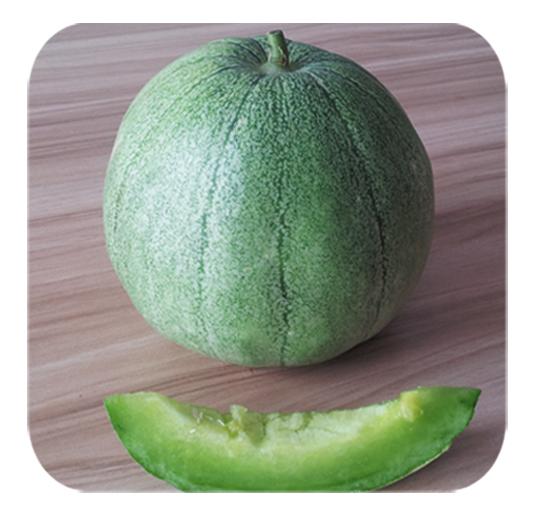 早熟薄皮甜瓜品种,雌花开放至果实成熟24-26天成熟左右,果实梨形,果型外观周正,绿皮绿肉,果肉脆